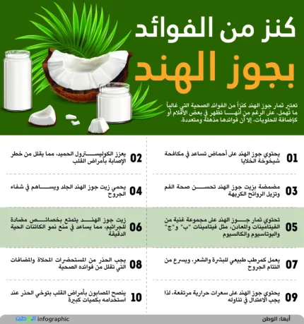 - زيت جوز الهند يتمتع بخصائص مضادة للجراثيم، مما يساعد في منع نمو الكائنات الحية الدقيقة.